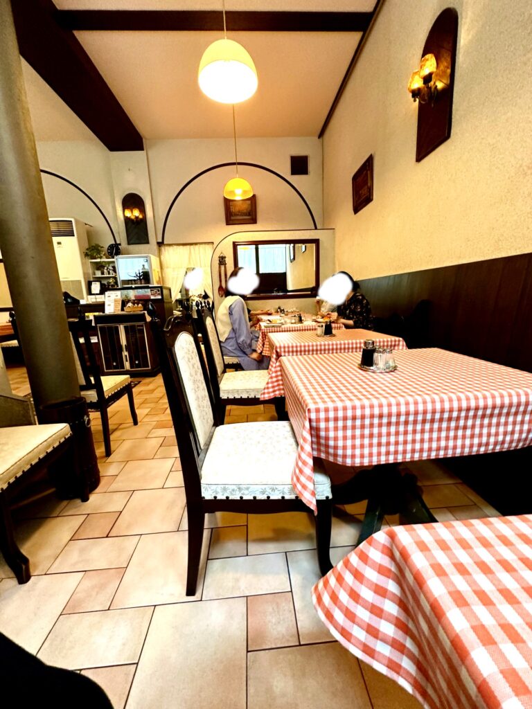 クラシックな調度品やギンガムチェックのレトロなテーブルクロスがなんともノスタルジックな雰囲気を漂わせている店内は半地下になっているので天井が高く開放感があります