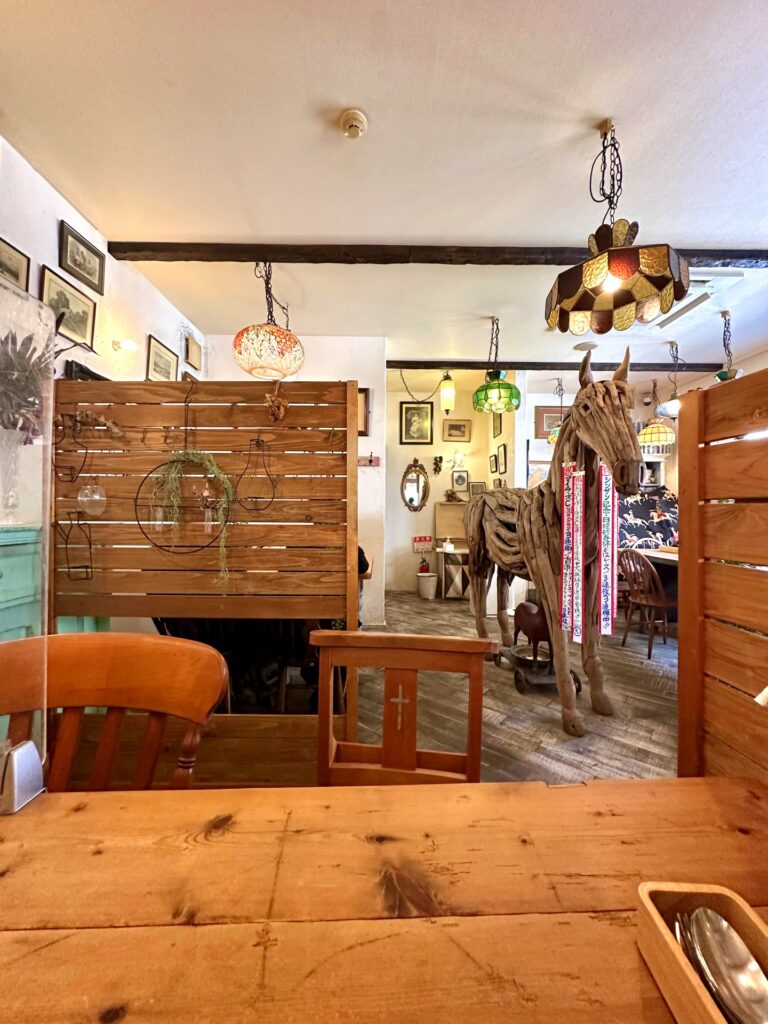 アンティーク調のインテリアに大きな木馬のオブジェがドーンと設置されており、店内はどこか懐かしさを感じる落ち着いた空間です。